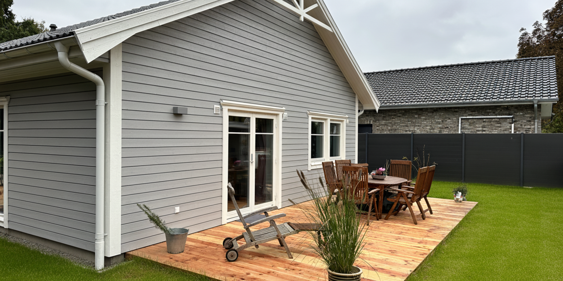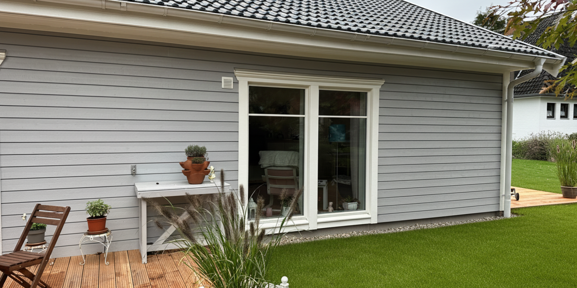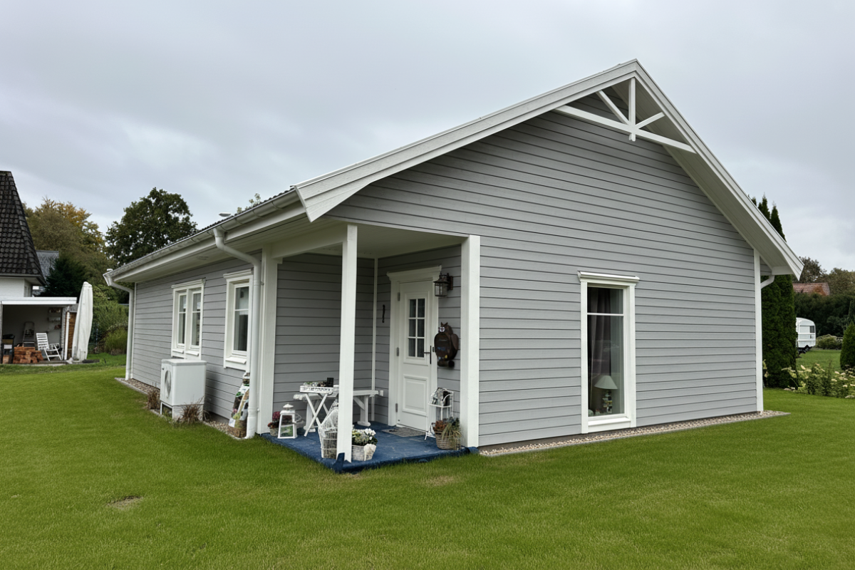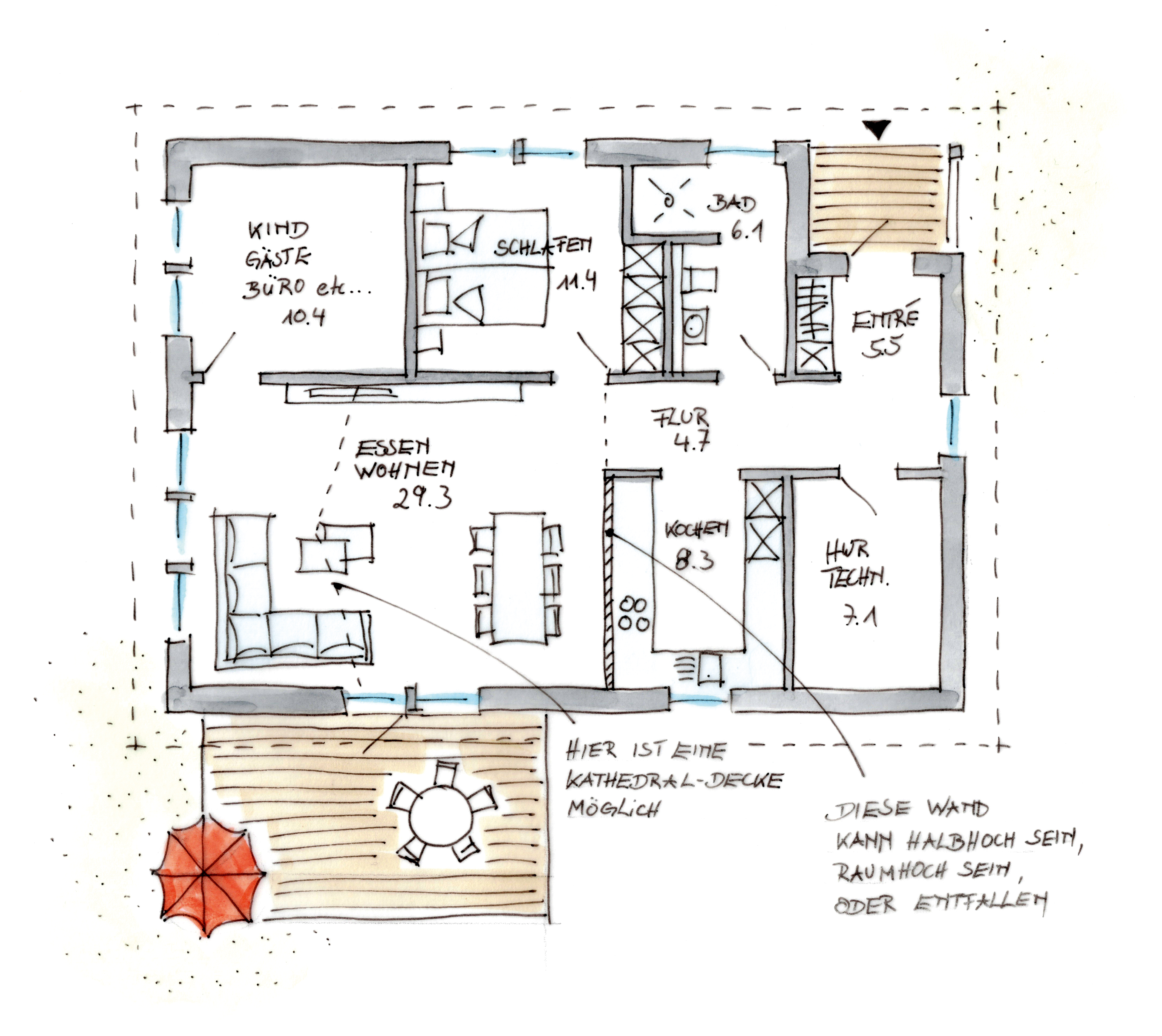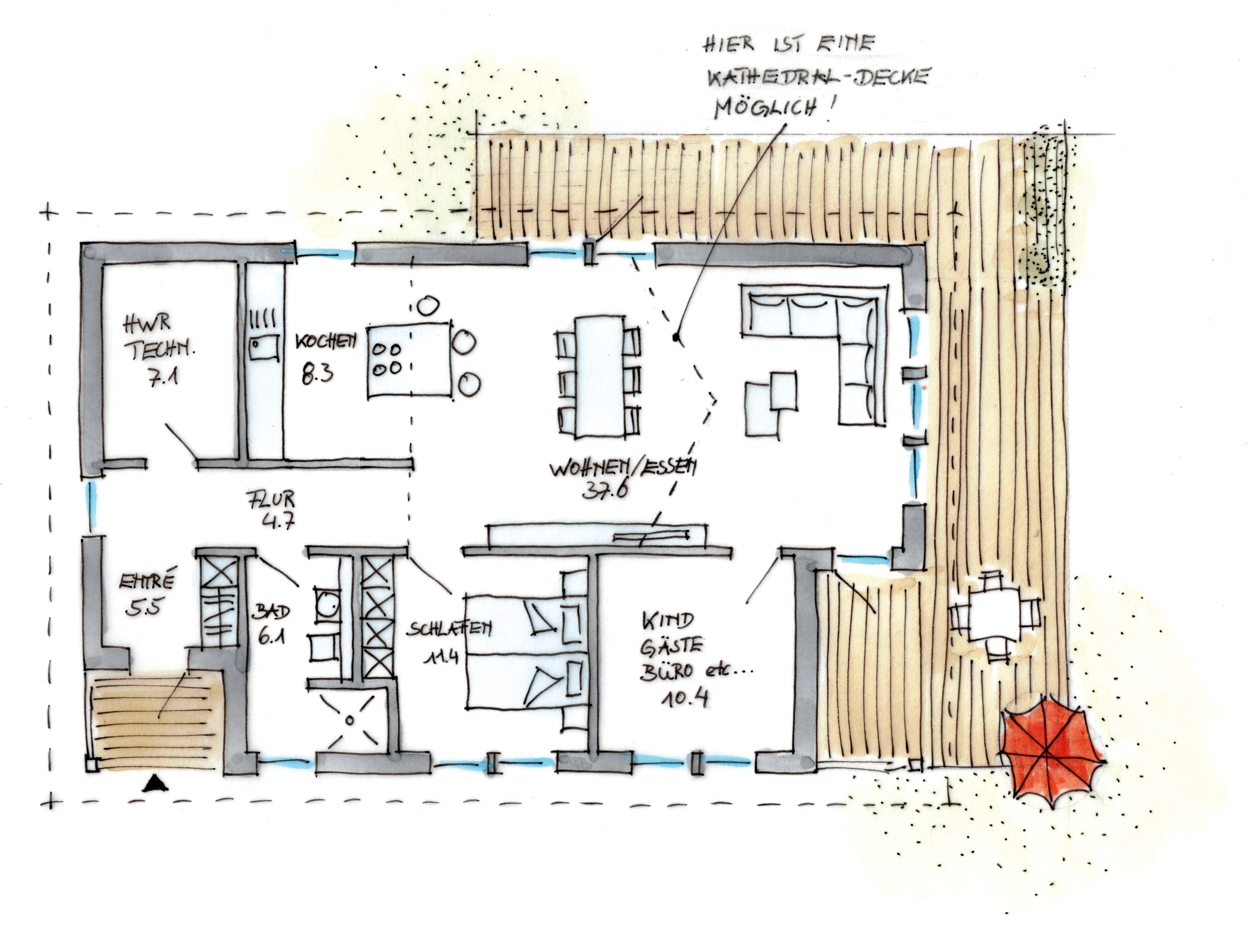 Dieses Haus kommt eher leise daher, aber es kann eine Menge. Man kann es spiegeln, der überdachte Eingang kann im Norden, Süden, Osten oder Westen sein. Es kann eine über- dachte Terrasse bekommen oder auch ohne Terrassenüberdachung ganz platzsparend auf dem Grundstück platziert werden.